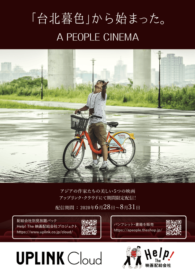 アップリンク・クラウドが展開する「Help! The 映画配給会社プロジェクト」。配給会社別に映画見放題パック配信を行っている。そこに、アジアと日本を結ぶカルチャーサイト、A PEOPLE( https://apeople.world/ja/ )が参加する。サイトを母体にしながら、「作家の作品性」にこだわった、アーティステッィクなアジア映画を配給する「A PEOPLE CINEMA」(エーピープル・シネマ)。ホアン・シー「台北暮色」、チャン・リュル「慶州(キョンジュ)ヒョンとユニ」、そして、シルヴィア・チャン「あなたを、想う。(念念)」。A PEOPLEのメンバーが日本配給を手掛けた、チャン・ゴンジェ「ひと夏のファンタジア」。チャン・リュルの2016年作品「春の夢」(スプリングハズカム配給)は、今回特別にA PEOPLE CINEMAとのコラボレーションが実現。計5作品、アジアの作家たちの独創的な映像表現をきっと体感できるはず。ぜひご高覧を。アジアの作家たちの美しい5つの映画アップリンク・クラウドにて2020年、6月28日から8月31日まで期間限定配信。