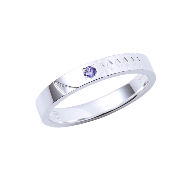 平打ちリングの表面にツノと刀の柄巻きを取り込み、イメージカラーのアイオライトのストーンをセット。内側にはリムルのアイコンを刻印しました。