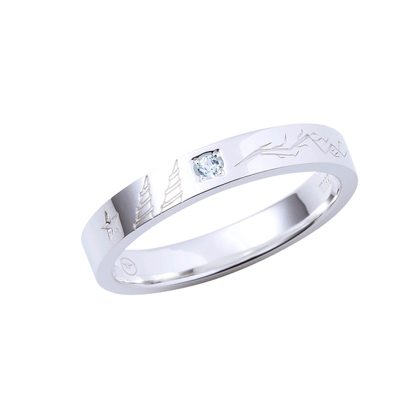 平打ちリングの表面にツノと黒稲妻を取り込み、イメージカラーのアクアマリンのストーンをセット。内側にはリムルのアイコンを刻印しました。
