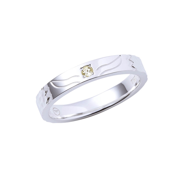 平打ちリングの表面にドラゴンらしいツノと体表をイメージした槌目加工を施し、イメージカラーのレモンクォーツのストーンをセット。内側にはリムルのアイコンを刻印しました。