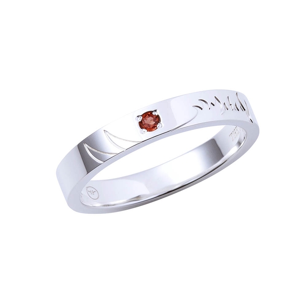 平打ちリングの表面にツノと黒炎を取り込み、イメージカラーのガーネットのストーンをセット。内側にはリムルのアイコンを刻印しました。