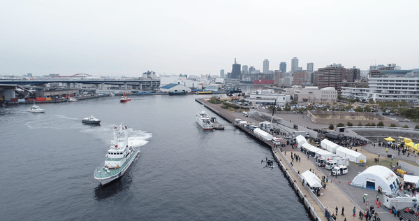 ①救出救助訓練実施エリアを含めた複数地点においてドローンを同時運用し、被害状況のリアルタイム中継及び避難広報(多重言語)の実施