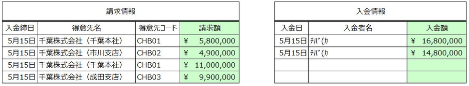 ●複雑な入金 ※請求:入金=N:n:例えば、同じ請求先に対して担当営業が異なるため複数回(n回)に分けて発行した請求書があり、得意先の入金も請求と等しくない回数(N回)で行われている。