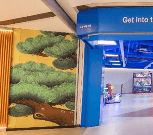 日本の本物の文化を日本発のゲームセンターから発信したいという想いから、総本店、大阪道頓堀本店で採用した日本の伝統的な舞台美術「松羽目」。