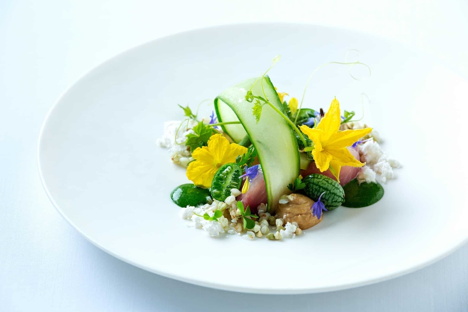 魚料理は「鯉と胡瓜(キュウリ)」です。苔庭に咲く花畑をイメージしています。皿のなかで鮮やかな黄色の花を咲かせているのは、エストラゴン(ハーブのひとつ)で風味をつけたハナキュウリです。花畑のなかには、燻製と洗いにした鯉の腹身が見え隠れしています。味噌のクリームソースのほか、オリーブオイルの粉末や、バジルのソース、そばの実が、花畑をより華やかに彩り、食べるごとに異なる複雑な味が楽しめるひと皿です。