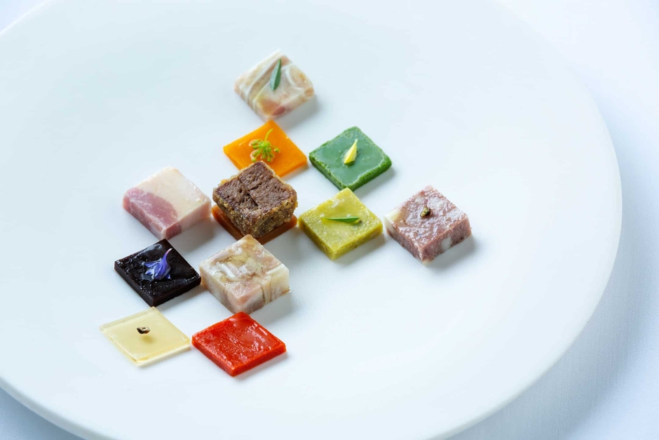 前菜の2品目、「シャルキュトリーのバリエ パヴェスタイル」は、夏の光が降り注ぐ別荘の苔庭に並べられた石畳を表しています(パヴェとはフランス語で石畳の意味)。豚肉の5つの部位を使用し、低温で火入れをしたコンフィやパテ、ひと口カツなどの調理方法を変えたそれぞれが、石畳を模して皿に盛られます。周囲にあしらわれた彩りあるキューヴは、ピューレ状にした、トマトやルッコラ、パプリカなどの野菜です。