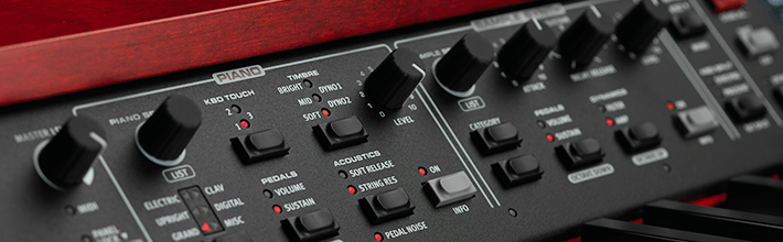 • Piano ティンバー / EQ セッティング (Soft、Mid、Bright)、エレクトリック・ピアノ・フィルター (Soft、 Mid、Bright,Dyno 1 and Dyno 2)