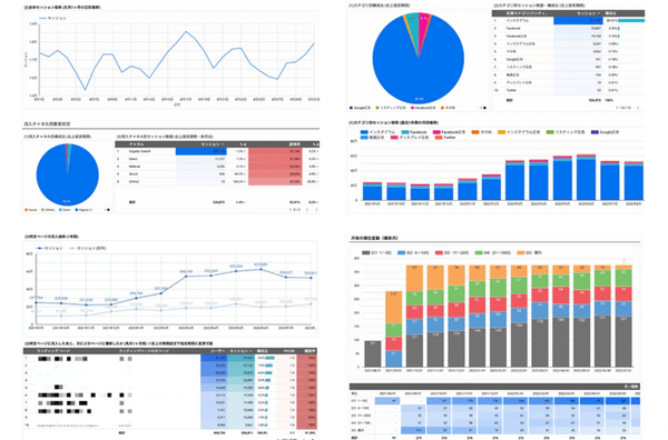 流入経路(GoogleやYahooなどの自然検索、TwitterやFacebookなどのSNSからの流入)、行動(離脱率、滞在率)、コンバージョン(メルマガや会員登録、お問い合わせ)の内容を分かりやすく可視化したレポートになっています。詳しくはお問い合わせください。