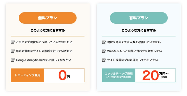 レポートのみであれば無料ですが、レポーティングの内容をもとにしたミーティングの実施、問題解決などのコンサルティングを受けたいという企業様向けには有料プランもご用意しています。
