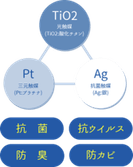 「delfino」は、光触媒(酸化チタン)、抗菌触媒(銀)、三元触媒(プラチナ)などの触媒を組み合わせることで、それぞれの触媒反応が持つ効果を相乗的に発揮させながら、それぞれの弱点を補うという発想の抗ウイルス・抗菌・防臭剤です。