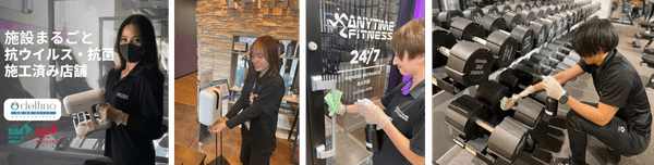24時間年中無休のフィットネスジムANYTIME FITNESS (エニタイムフィットネス)が空間内を抗菌コーテイングする「delfino」を直営店169店舗に先行導入!より高いレベルで「安全」「安心」「清潔」「快適」な環境を実現