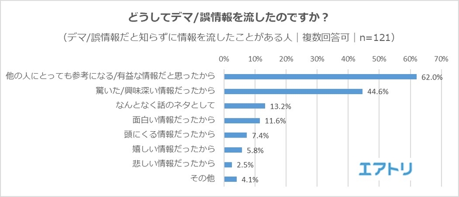 デマ/誤情報だと知らずに情報を流したことがある人に対し、どうして情報を流したのかを聞いたところ、6割以上の人が「他の人にとっても参考になる/有益な情報だと思ったから」(62.0%)と回答しており、人のために良かれと思ってしたことが裏目に出てしまう結果となったようです。
