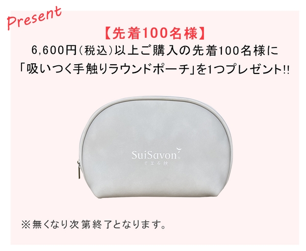 ➁ 6,600円(税込み)以上ご購入の先着100名様に「吸いつく手触りラウンドポーチ」をプレゼント