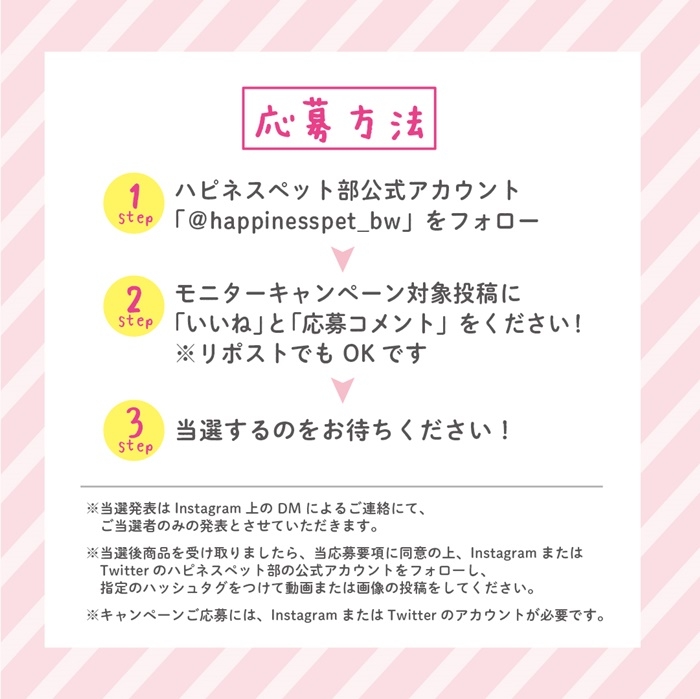 InstagramまたはTwitterのハピネスペット部の公式アカウントをフォローし、