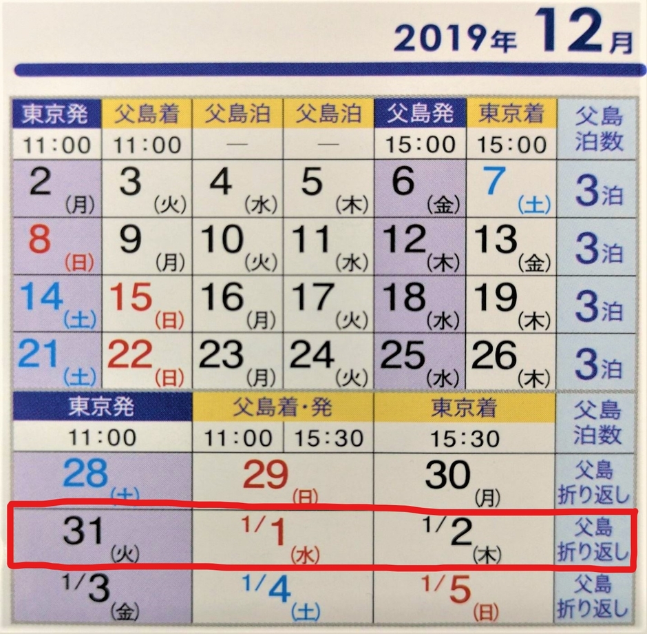 通常おがさわら丸は1週間かけて1往復しています。そのため、小笠原旅行は最低5泊6日(船中2泊)が必要なんですが、今年の年末は【着発便】という運航があります。