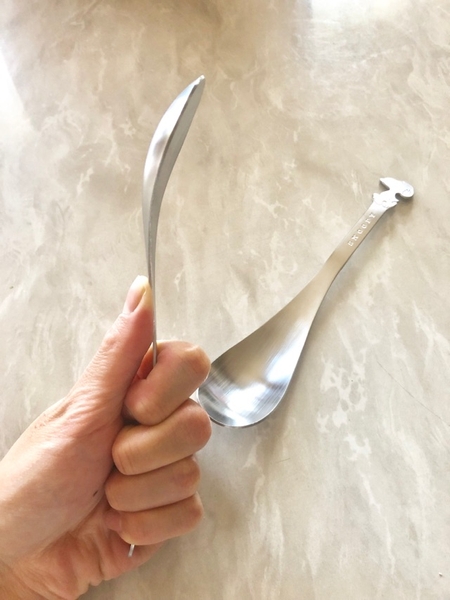 親指でスプーンのすくう部分の根本をおさえると、持っている部分に力が入りやすくなり、親指部分に力を入れるとグッと曲がるのです。