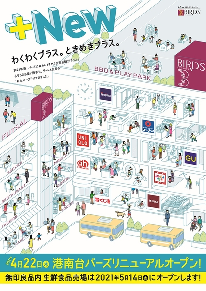 JR港南台駅前に1976年に開業し、地域にお住まいの方の生活利便施設としての役割を果たしてきた「港南台バーズ」は、髙島屋港南台店が入居していた約17,000㎡を専門店として増床。「+(プラス)New わくわくプラス。ときめきプラス。」をキャッチコピーに、エリアの魅力とにぎわいを創出するショッピングセンターを目指し、新生「港南台バーズ」として誕生します。