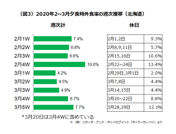 北海道の3月1~3週は4%台まで外食率が低下。特に緊急事態宣言後最初の週末(2月29、3月1日)の外食率は2%と非常に低かった。宣言解除後は、外食率が徐々に高まり、3月最終週の週末(28、29日)は12%と宣言が出される前の水準に戻っている。