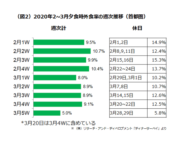 ●首都圏週末の外食率は、3月末週で6%。それ以前はイベント自粛要請中でも10~15%の高水準。(図2)