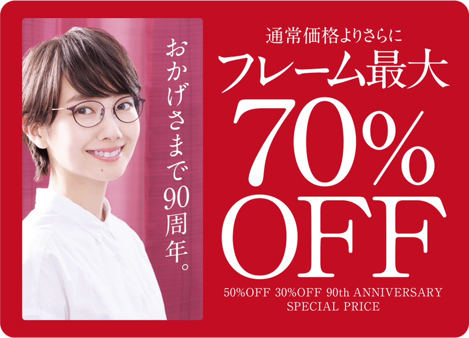 フレーム70%・50%・30%OFF特価コーナーをご用意。今ついている値札から、お会計時に値引きをいたします。※メガネ一式(フレーム+レンズ)ご購入時の適用となります。