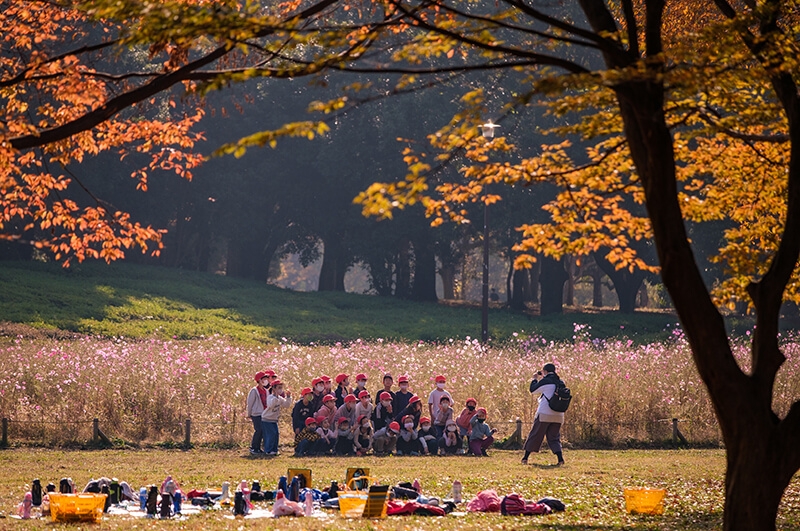 誰の心にも仕舞い込まれている思い出の〝宝箱〟を、そっと開けて見せてくれたような珠玉の作品です。シャッターチャンスがいい、距離感がいい。そして手前に広げられたお弁当の入った荷物や水筒などの散らばり方も、この後の〝楽しい時間〟を見る人に想像させてくれます。主役の子供たちや先生だけでなく背景のコスモスや木立などにも深い味わいがあります。ややコントラストの低いところなども〝追憶〟をイメージさせて効果的です。(板見 浩史)