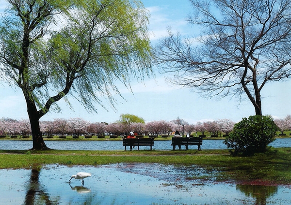 長い冬も終わり桜は満開、新緑も見え始めた春風景を爽やかにまとめました。両側に配した樹とベンチ、さらに水たまりに映った樹のシンメトリーが美しくすっきりした雰囲気です。また、シラサギの存在が点景として作品に変化を与え、水をついばむ様子ものどかさを感じさせてくれます。水面の揺らぎ、葉のなびく様子から風も感じられ、ベストなシャッターチャンスだったと思います。こんな所で癒されたい気分にさせられます。(中田 達男)