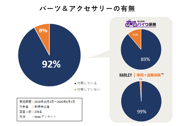当社の新規契約者を対象に行ったアンケートでは、全体で92%(「みんなのバイク保険」新規契約者は89%、「HARLEY|車両+盗難保険™ 」新規契約者は約99%)の方がバイクのカスタムを行っていることが分かりました。