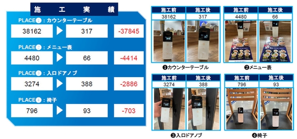 試験方法:ATPふき取り検査(A3法)※で作業前後の汚れの数値を計測したところ、作業前と比べて作業後の数値が大幅に減少しており、高い抗菌・抗ウイルス効果を生んだことが分かります。光触媒は蛍光灯などの光が当たると、抗菌・抗ウイルス作用が発生します。よって、コーティング後は日常生活を送るだけで、この数値はどんどん下がっていきます。