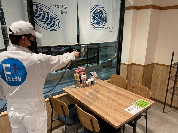 そしてこの度、よりお客様に安心してご利用いただきたいとの思いから、「除菌・除ウイルス・抗菌・抗ウイルス・消臭・防カビ・防汚」効果のあるONEの光触媒コーティングと、飲食店検索サイト「Retty」の安心・安全店舗まとめ特設ページへの掲載がセットとなった飲食店向けの新サービス「FRESHION FOOD(フレシオンフード)」の導入に致りました。