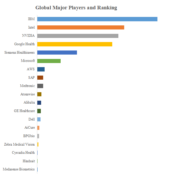 YHResearchのトップ企業研究センターによると、医療における人工知能の世界的な主要製造業者には、IBM、Intel、NVIDIA、Google Health、Siemens Healthineers、Microsoft、SAP、AWS、Medtronic、Atomwiseなどが含まれている。2022年、世界のトップ10企業は売上の観点から約29.0%の市場シェアを持っていた。