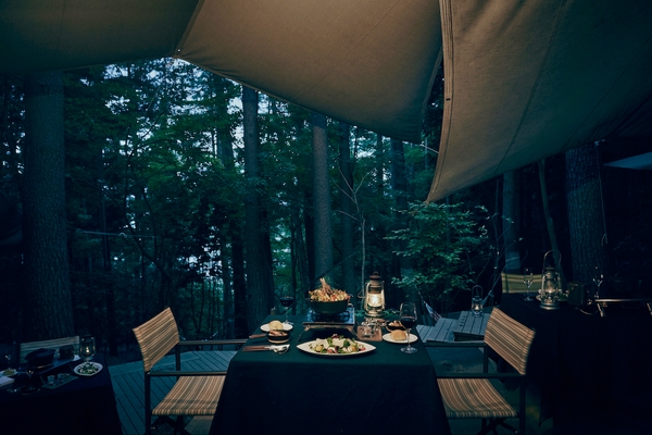 標高約900mの丘に広がる星のや富士には、針葉樹の木立に囲まれた森の中に、風通しの良いタープが3つ設置された屋外ダイニングがあります。それぞれのタープの定員は2組のみ、最大6組限定で「狩猟肉(ジビエ)ディナー」を通年で提供しています。この夏限定の特別仕様として、メインの鹿肉や牛肉を屋外キッチン内の焚き火で豪快にグリルする体験が楽しめます。コースのメニューには、猪のベーコンをスモーカーで手軽に燻製体験ができるものもあり、キャンプの醍醐味を満喫できます。