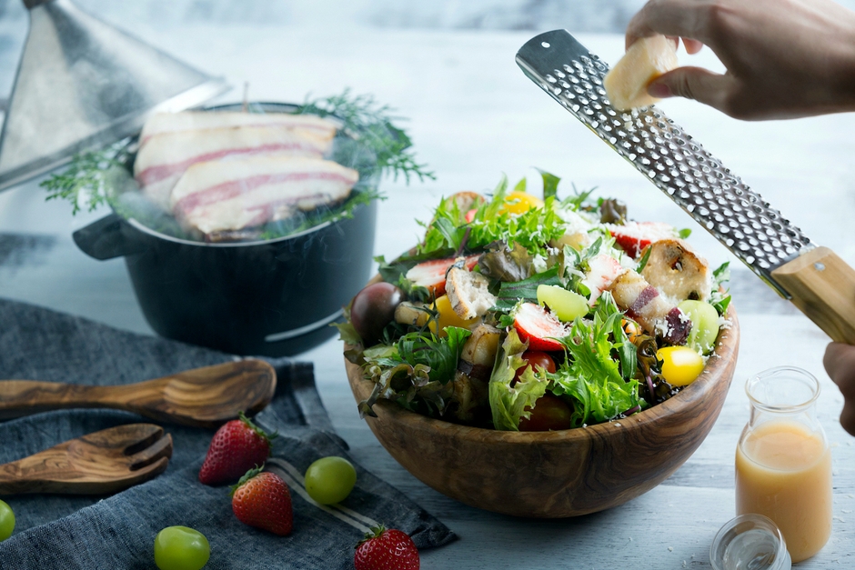 冷前菜 :猪ベーコンの瞬間燻製とフルーツのサラダ