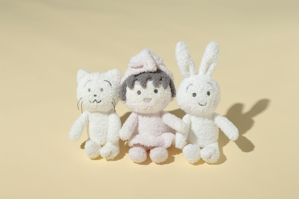今回のコラボレーションでは、まるちゃんと、お馴染みのうさぎとねこのぬいぐるみが登場。ジェラート ピケのウエアの中でも、ふわふわでさらりとした肌触りが特徴の‘パウダー’素材を使用しました。優しい表情のキャラクターと肌触りがマッチしたスペシャルなアイテムです。