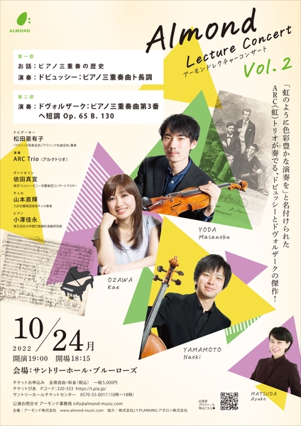 アーモンド株式会社(代表:松田亜有子)主催、『Almond Lecture Concert Vol.2』が2022年10月24日(月)にサントリーホール・ブルーローズ(東京都港区赤坂1-13-1)にて開催されます。