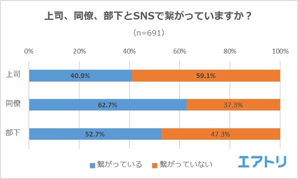 同僚、部下は「繋がっている」が半数超え。4割は上司と「繋がっている」と回答。