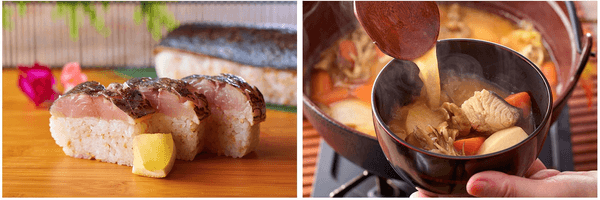 左:日本の伝統料理として各地に伝わる「なれ寿司」。和歌山県でも、さんまやさばを使ったなれ寿司が昔から親しまれています。皮目を炙って旨味を引き出した脂の乗ったさばとシャリの組み合わせはいくつでも食べられる美味しさです。