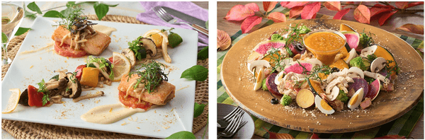 右:フリット(揚げ)、ベイクド(焼き)、スチーム(蒸し)と手法を変えて調理した野菜で仕立てる「オータムニソワーズサラダ」。それぞれの野菜に最適な調理方法で引き出した、素材の美味しさを味わって。