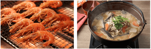 左:海老の網焼きは香ばしい香りに食欲が刺激されます。