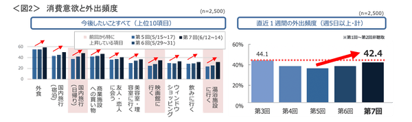 ◆【消費意欲と外出頻度】「今後したいこと(すべて)」について聞いたところ、いずれの項目においても前回と比べ意向度がさらに上昇し、消費に意欲的な回答がみれらた。外出頻度も3回目調査の4月初旬とほぼ同程度まで回復。制限緩和が進み日常を取り戻しつつある中で、消費意欲や外出意欲も徐々に高まっていることが窺える。<図2>