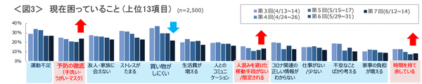 【現在困っていること】については、「手洗い・うがい・マスクなどの感染予防の徹底」が上昇。また「人混みを避けた移動手段がない/限定される」「時間を持て余している」も微増した。マスク着用やソーシャルディスタンスの確保が習慣化しつつある状況に対して、夏本番を前に”予防を徹底したくても難しい”といった様子が窺える結果となった。<図3>