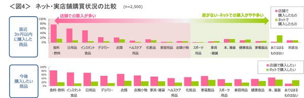 今回調査ではネット・実店舗購買状況の比較も行った。【直近3ヶ月以内に購入した商品】では、「食料・飲料・日用品・インスタント食品」が実店舗で購入される傾向が強い一方、「家電・健康食品・本・家具・スポーツ用品」はネットと実店舗での購入傾向に差がみられなかった。なお、【今後購入したい商品】については、いずれも実店舗で購入したいという商品が多い。<図4>
