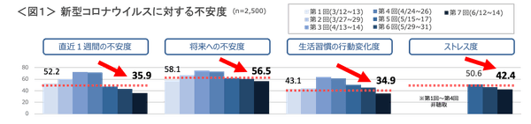 株式会社クロス・マーケティング(本社:東京都新宿区、代表取締役社長:五十嵐 幹)は、新型コロナウイルスが消費者の行動や意識に与える影響の把握を目的として、全国47都道府県に在住する20~69歳の男女2500人を対象に「新型コロナウイルス生活影響度調査」を実施。第1回(3月12日~13日)から隔週で実施しており、第7回となる今回は、緊急事態宣言解除後の、徐々に出勤・登校が増え始めた6月12日~14日に調査を行い、人々の意識・行動について分析しました。