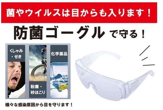飛沫感染は口からだけではなく、目からも入ります。その感染を食い止める為に開発した防菌ゴーグルです。440円(税込)のお買い求め易い価格に設定しました。
