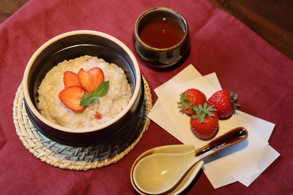 界 川治では、いちごを使用した「いちごのミルクがゆ」を夜食に用意します。就寝前でも食べやすいさらさらしたミルクがゆと、甘さと酸味をお好みで調整できるよう、生いちごといちごジャムを別添えで提供します。ホットミルクの甘さといちごの酸味のかけ合わせが絶妙な一品です。里山の風情を感じる客室の掘り炬燵で温まりながら味わうことができます。