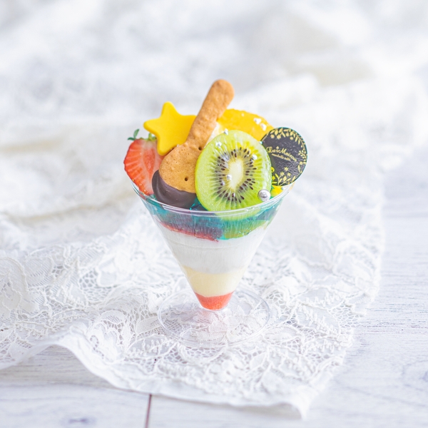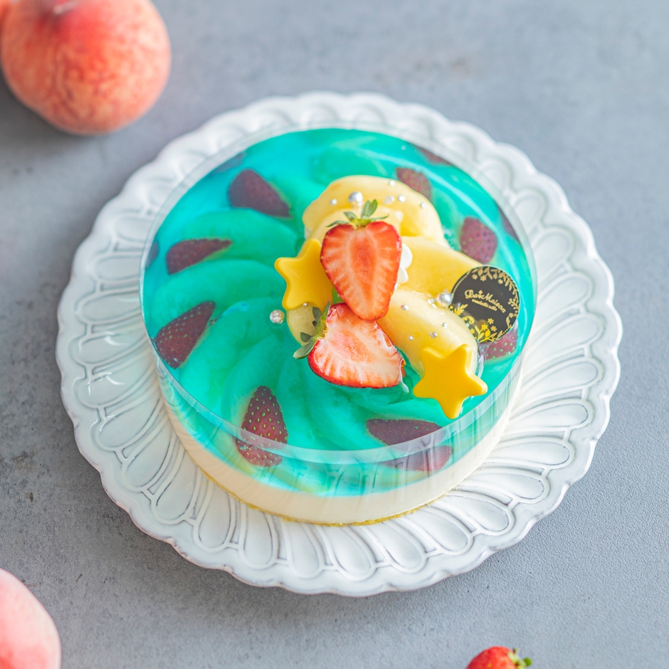 なめらかなフロマージュムースに旬のみずみずしい白桃やいちごを爽やかなブルーキュラソーのジュレにとじ込めました。