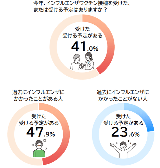 大正製薬株式会社が行った調査によると、今年インフルエンザワクチン接種を受けた・受ける予定のある人の割合は41.0%であることが判明しました。また、過去にインフルエンザにかかったことがない人に比べて、かかったことがある人の方がインフルエンザワクチン接種を受ける意向が強いことも明らかになりました。過去にインフルエンザにかかり、つらい経験をしたからワクチン接種を受けようと考えている方が多いのかもしれませんね。