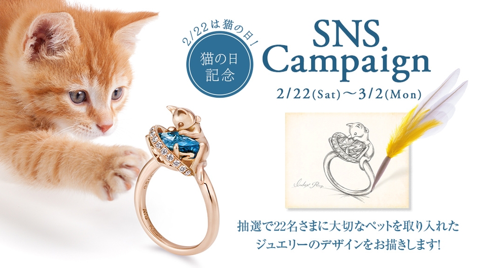 全国にジュエリー店舗を展開するオーダーメイド企業の株式会社ケイ・ウノ(本社:愛知県名古屋市、代表取締役:久野雅彦、以下「ケイ・ウノ」)は、猫の日(2月22日)を記念して、犬や猫などのペットにまつわるストーリーを募集します。応募ストーリーの中から、22(にゃんにゃん)名さまに、ストーリーを基にしたジュエリーデザイン画をプレゼントするほか、投稿数に応じて、動物福祉活動を行う日本初の寄付サイトを運営している公益社団法人アニマル・ドネーションへ寄付を行います。(1投稿につき1,000円寄付 ※上限100,000円)