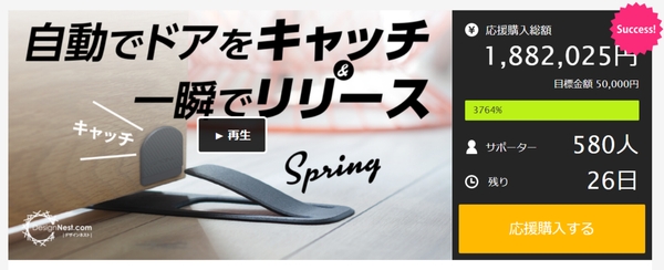 株式会社ウィズキュリオス(本社:福岡県福岡市/代表取締役:上崎 圭哲)は、しゃがまずに自動でドアをキャッチして、リリースも一瞬で済むドアストッパー【Spring/スプリング】の選考予約をクラウドファンディングサービス「Makuake」にて実施中です。これまでにご予約の人数が565人を超えました。