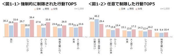 ☑ 趣味や好きなことで直近1カ月で強制的に制限された行動のTOP5では、全体で「旅行」「ショッピング」「外食」「映画鑑賞」となった。<図1-1>同じく直近1カ月で任意で制限した行動のTOP5では「任意で制限した行動はない」がそのほかの行動より圧倒的に多い結果に。また、性別では女性より男性の方が「任意で制限した行動はない」と回答した割合が高かった。<図1-2>