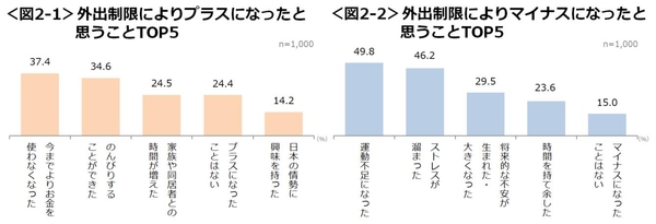 ☑ 外出制限によりプラスになったことは「今までよりお金を使わなくなった」(37.4%)で最多。「のんびりすることができた」(34.6%)、「家族や同居人との時間が増えた」(24.5%)と続く。<図2-1>マイナスになったことでは「運動不足になった」(49.8%)が半数近くを占め、「ストレスが溜まった」(46.2%)も高い割合となった。<図2-2>